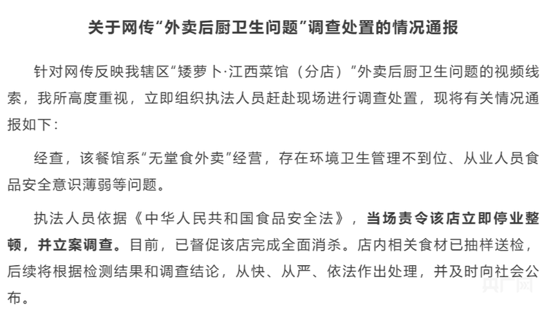 佛山顺德大良发布“外卖后厨卫生问题”情况通报:停业整顿、立案调查