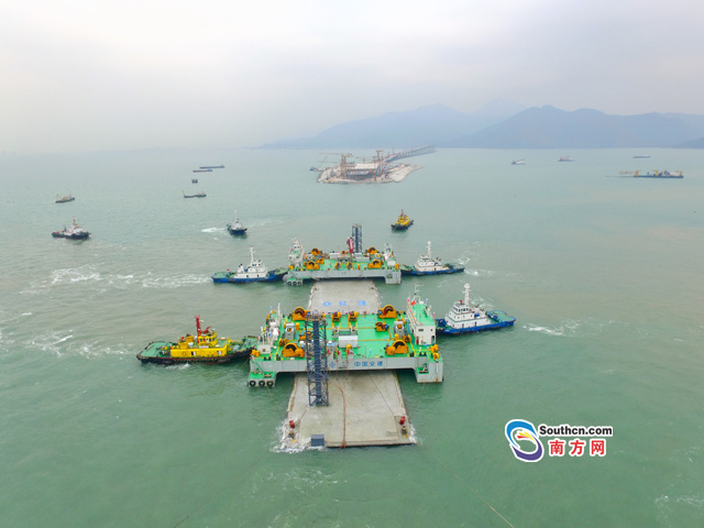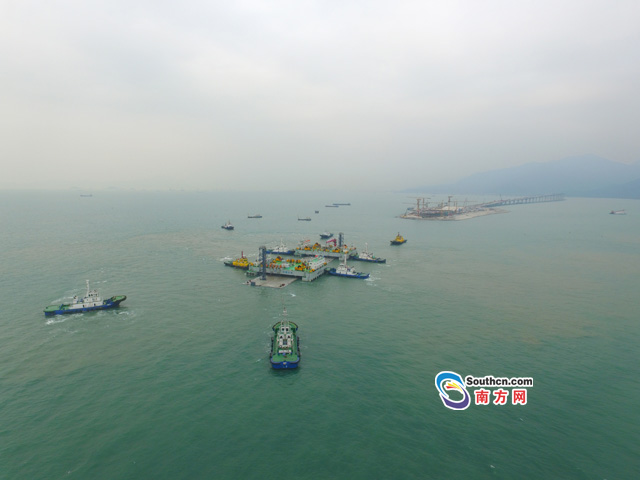 据南方网报道,3月6日早上7:20,港珠澳大桥海底隧道最后一节沉管E30从桂山岛出坞,经过数小时的编队、浮运,于中午13:30左右到达东人工岛附近施工海域进行沉放准备,预计凌晨进行沉放。