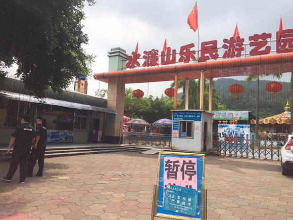 4月20日上午,记者来到了水濂山乐民游艺园,入口处立着“暂停营业”公告,显示“正在检修,严禁操作”。游艺园的伸缩门张贴有封条。