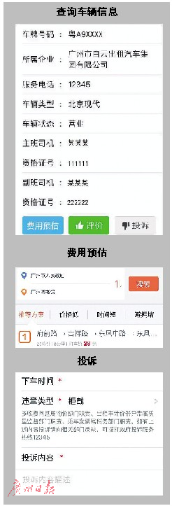 点击“投诉”按钮,输入个人联系方式及投诉内容等信息,即可对出租汽车的服务质量进行投诉,市交通部门表示将会在完成调查后回复市民处理情况。
