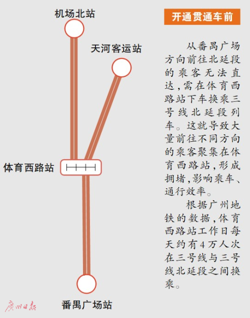 从番禺广场方向来的乘客可以搭乘贯通线直达机场北及北延段沿途车站,不需要在体体育西路站换乘,从而大大缓解了体育西路站的拥堵问题。