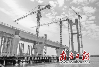 近年来,交通基础设施建设是广东“补短板”工作的重要一环。图为正在建设中的深茂铁路潭江特大桥。全媒体记者 吴伟洪 摄