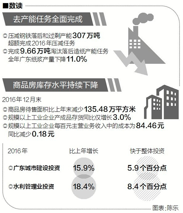 经过近一年的实践,广东交出了这样的成绩单:2016年,广东实现地区生产总值79512.05亿元,同比增长7.5%。这一年,广东压减钢铁落后和过剩产能307万吨,超额完成任务;国有关停类“僵尸企业”实现市场出清2394户;进一步清理规范行政事业性收费,每年为企业减负131亿元;启动补短板重大工程,将18项、总投资2.25万亿元的补短板重大工程纳入省重点项目调度。