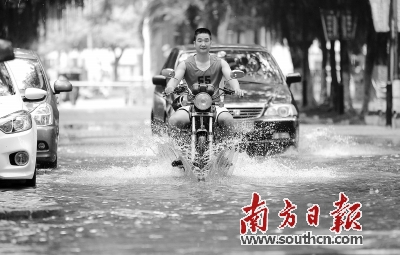 6日下午,一场暴雨过后,中山一名市民骑车蹚水而过。记者 叶志文 摄
