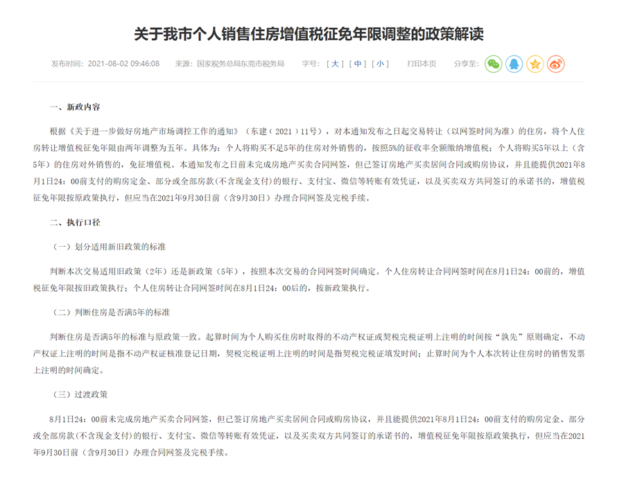 如何判断交易适用旧政策(2年)还是新政策(5年)?8月2日东莞市税务局对“莞八条”进行解读指出,个人住房转让合同网签时间在8月1日24:00前的,增值税征免年限按旧政策执行;个人住房转让合同网签时间在8月1日24:00后的,按新政策执行。