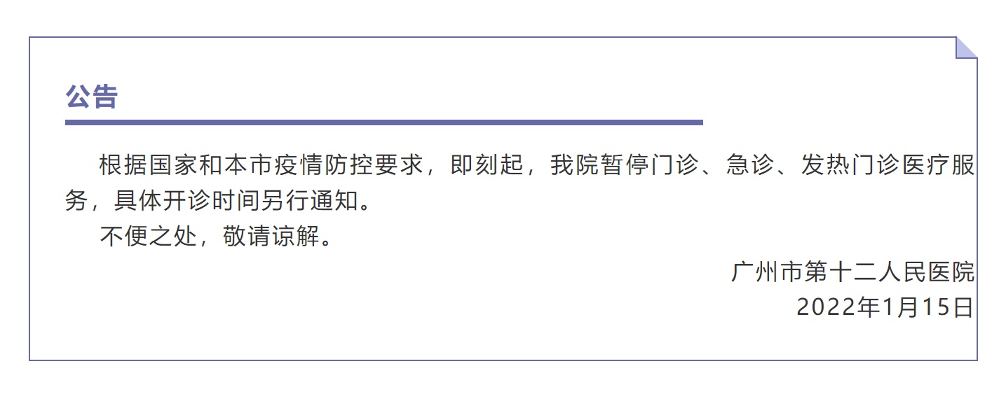 央广网广州1月15日消息(记者夏燕)1月15日晚,广州市第十二人民医院发布公告称,根据国家和本市疫情防控要求,即刻起,该院暂停门诊、急诊、发热门诊医疗服务,具体开诊时间另行通知。