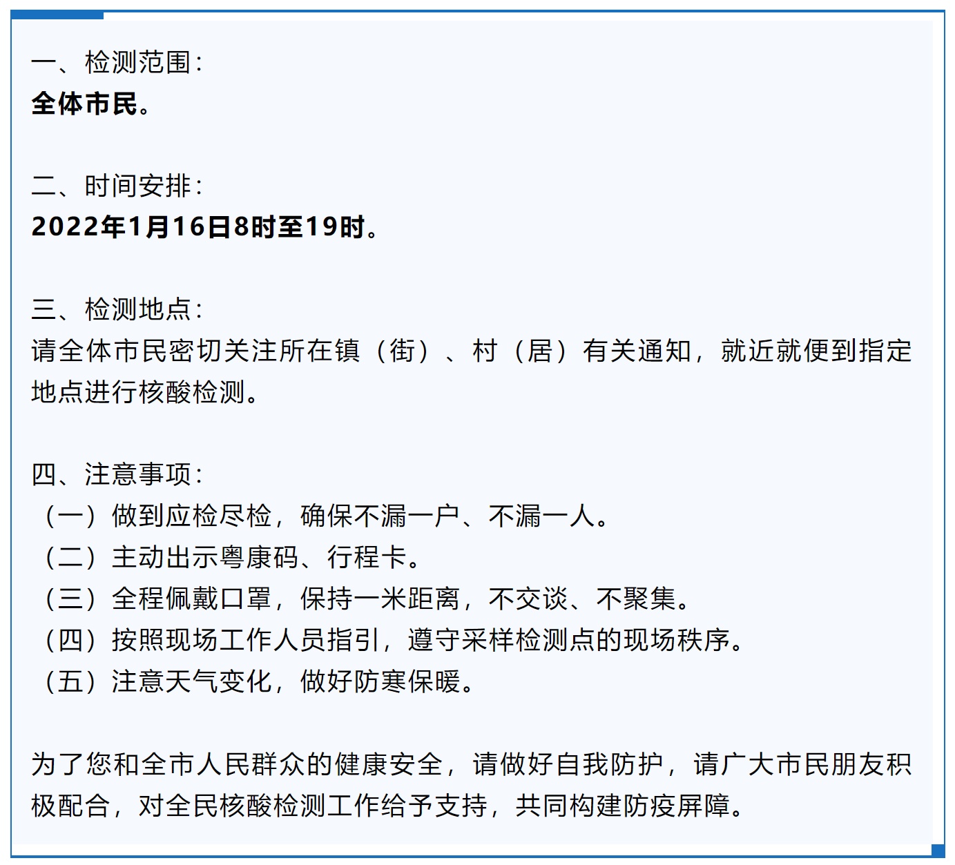 央广网珠海1月15日消息(记者 夏燕)1月15日晚,珠海市新型冠状病毒肺炎疫情防控指挥部发布通告,为保障人民群众生命安全和身体健康,珠海市定于2022年1月16日开展全员核酸检测工作。