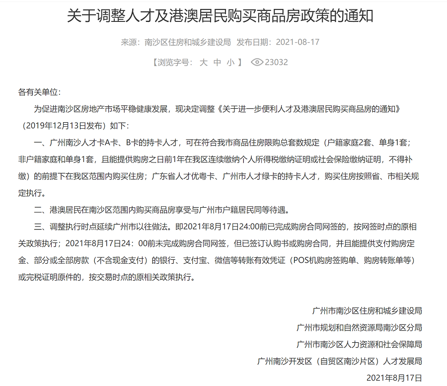 央广网广州8月18日消息(记者 夏燕)8月17日晚,广州市南沙区住房和城乡建设局发布了《关于调整人才及港澳居民购买商品房政策的通知》(下称《通知》),进一步收紧人才购房政策。