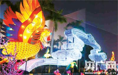 据主办方介绍,这次的彩灯展以“凤凰”寓意“鸡年”,象征“凤飞翱翔,四海求凰”的祥瑞之意。灯展以凤求凰的故事作为主背景,配以一群成双作伴的灵鸟,穿梭在桃花之间,祝愿香港市民新春快乐,天下有情人幸福美满。