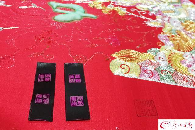 邓启荣告诉记者,客户如此提早未女儿定制嫁衣,他们会先准备好已经完成刺绣工序的布片,这些布料刺绣后并不裁剪、车缝,一共九片打包好就寄给客户,等待女儿结婚时提前半个月到一个月再寄回来,继续裁剪、车缝等工序,“我们制作完的每一片布料都会盖上自己特制的印章,印在布料边缘,无论将来何时,我们的传承人见到这个印章,也要无条件帮对方完成这件裙褂。”