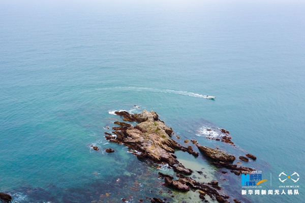 蔚蓝的海,海浪拍打着礁石,船只穿过,好一幅美丽的画卷。新华网发(陈楷摄)
