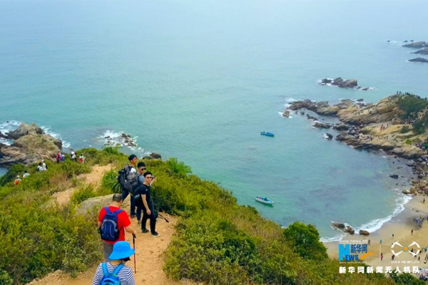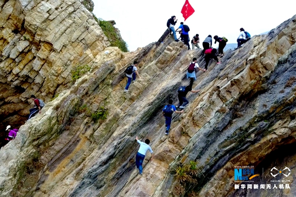每逢周末及节假日,驴友们就会组团相约于这条实际行走路程约八公里的穿越线路上,此时此刻,东西涌海岸线则变成了驴友徒步的最佳圣地。新华网发(陈楷摄)