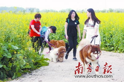 宠友们与狗狗一起游览油菜花田