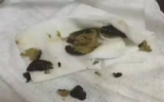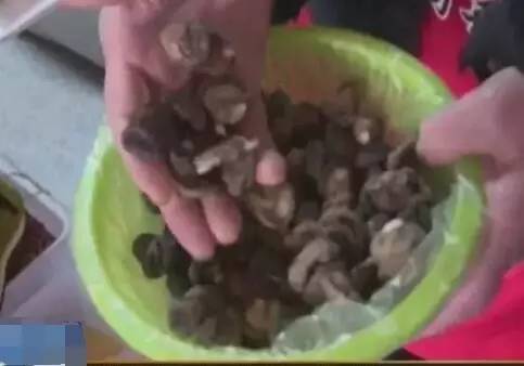 病人胃镜下面看到12指肠部位,就是胃和肠交接的地方,全部被香菇堵满,外面这些都是比较碎的,里面还有一个更大的整个的香菇,大概有7厘米左右。