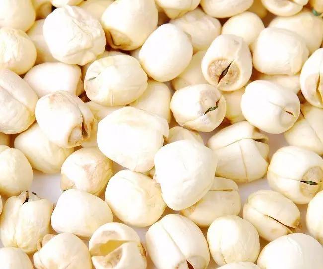又名干莲心,发涨发方法是,莲子和水的比例是1:3,然后加碱半两,煮沸,用帚子用力搅挫莲子,使莲皮脱落露出乳白色的本质,捞出来洗干净,再放到清水里面洗煮沸,去除碱味,再洗干净,然后加水浸没,放电饭煲里面上层蒸烂即可。