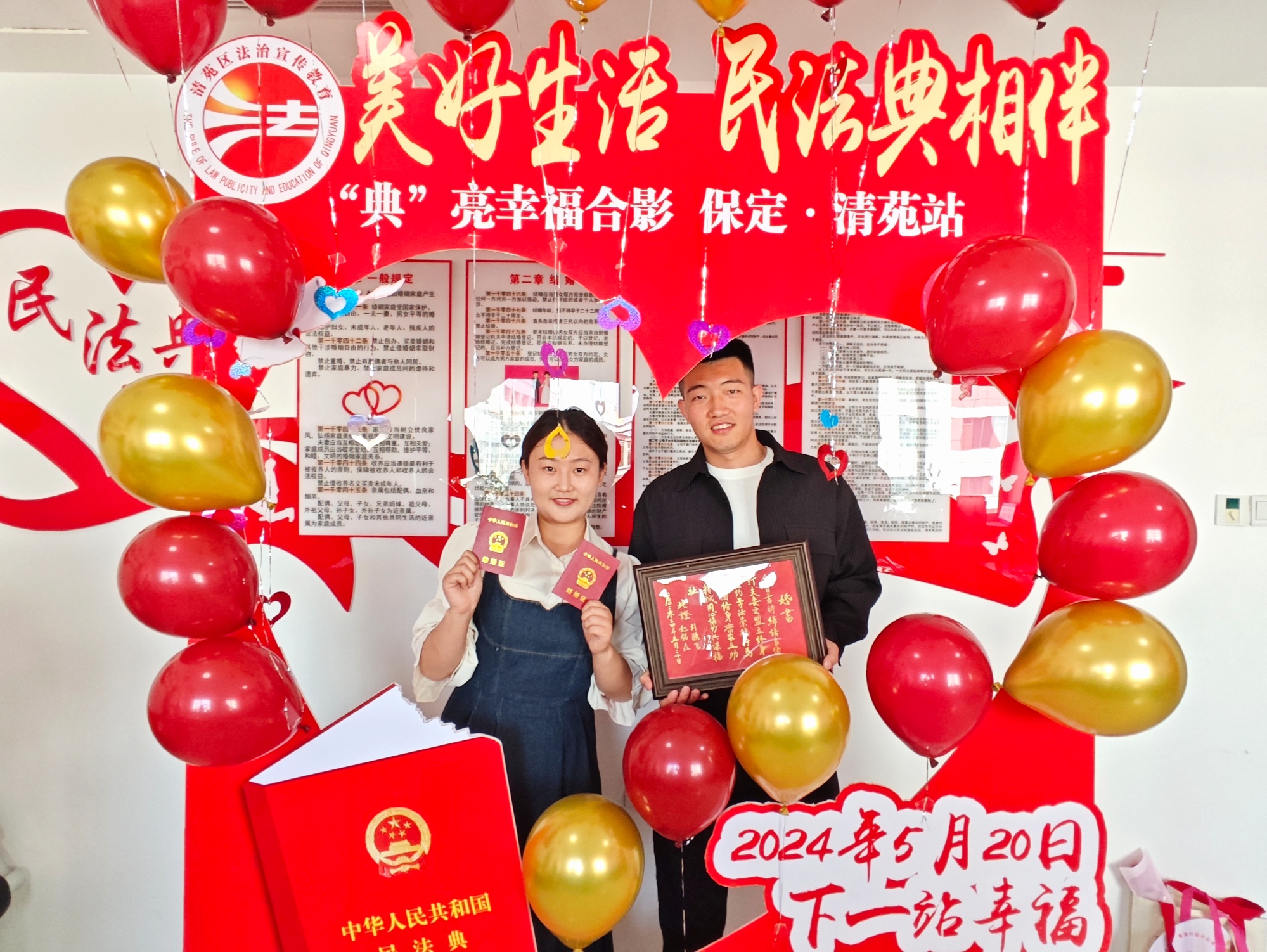 据了解,今年5月是第4个“民法典宣传月”,为进一步学习宣传民法典,倡导树立正确的婚姻观、家庭观和道德观,清苑区司法局、区民政局开展“典”亮“520”结婚登记日快闪活动,为新人送上“法”式祝福。
