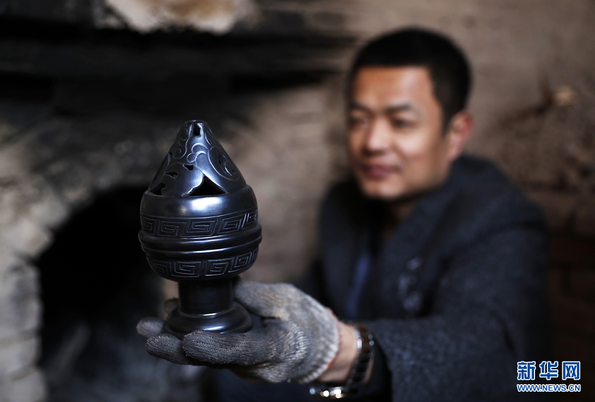 45岁的刘小伟是老匠人刘如喜的儿子,现在刘小伟已逐步接手黑陶厂,希望把黑陶更好的传承下去。新华网 张斌摄