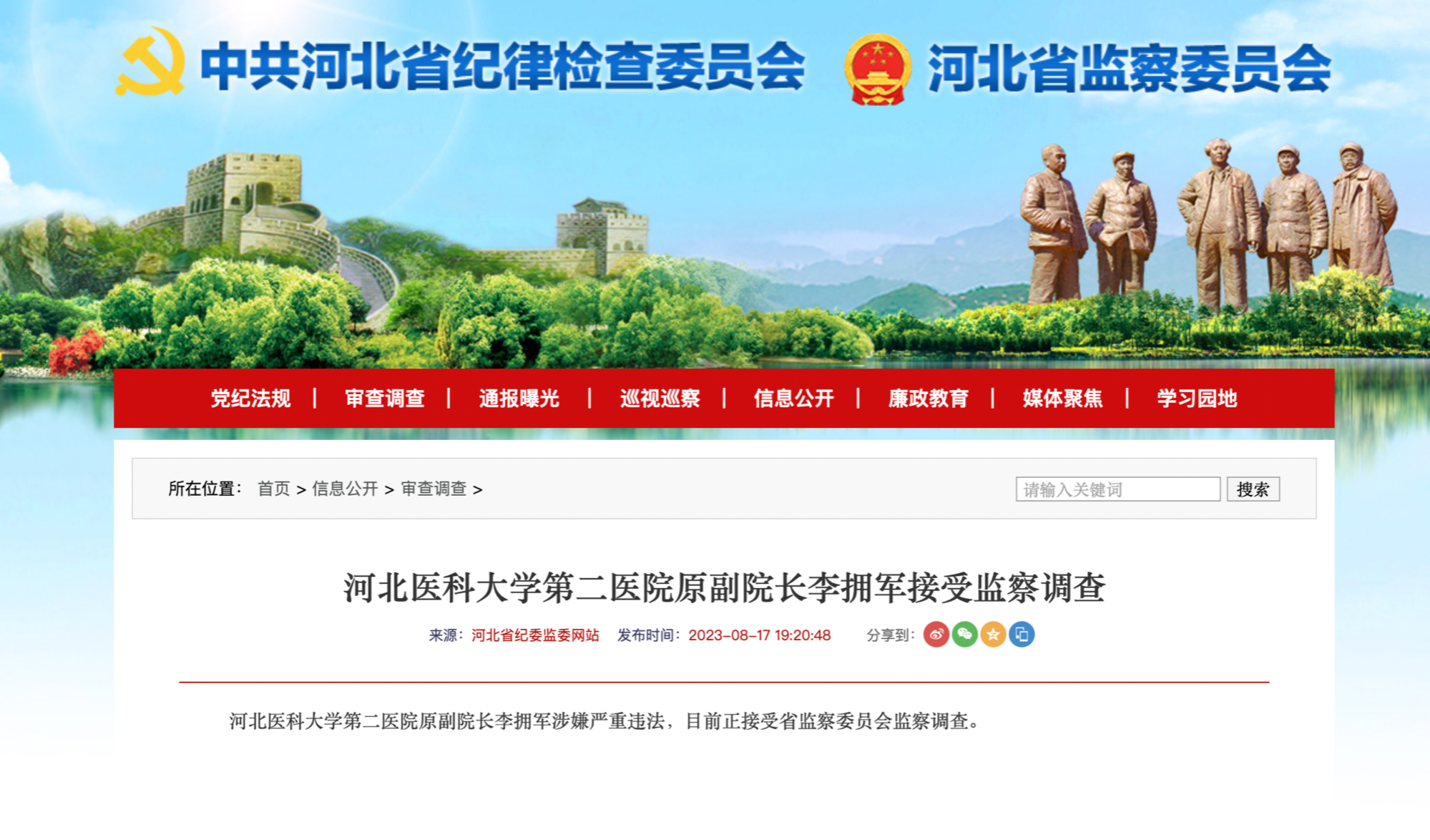 河北医科大学第二医院原副院长李拥军涉嫌严重违法,目前正接受省监察委员会监察调查。
