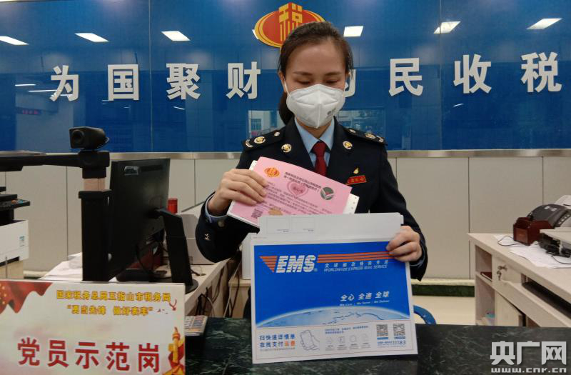 疫情期间,五指山市税务局提供“网上申领、邮寄配送”发票,图为办税服务厅工作人员邮寄发票,并附上来自五指山市税务局局制作的“连心卡” 通讯员 供图