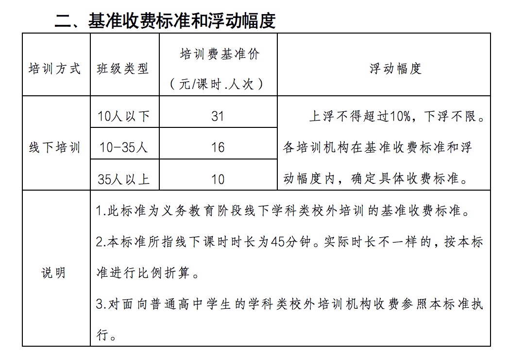 基准收费标准和浮动幅度方面,线下培训班级10人以下,培训费基准价为31元/课时.人次;班级10-35人,培训费基准价为16元/课时.人次;班级35人以上,培训费基准价为10元/课时.人次。上述三种班级类型收费标准上浮不得超过10%,下浮不限。各培训机构在基准收费标准和浮动幅度内,确定具体收费标准。