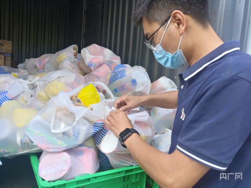 海口市龙华区商务局与爱心企业送来的“爱心礼包”(央广网记者 蔡文娟 摄)
