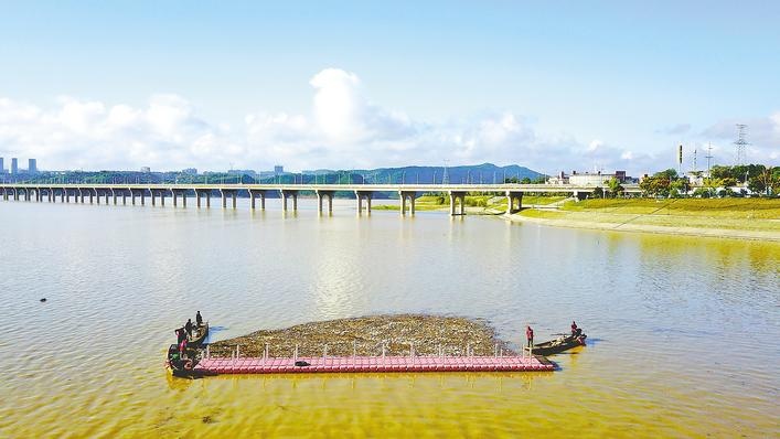 9月20日,清漂队员在丹江口库区郧阳段汉江水域清理漂浮物。