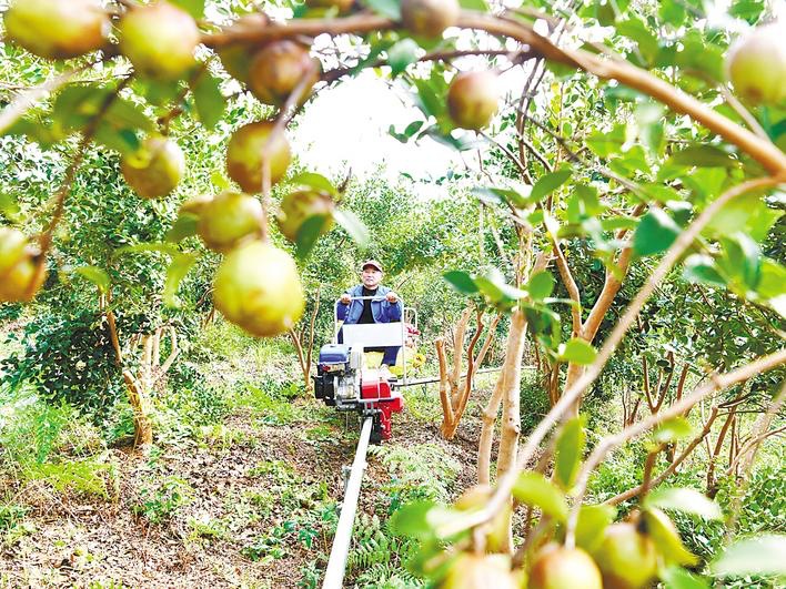 10月26日,在通城县塘湖镇阁壁村定武油茶专业合作社基地,漫山遍岭的油茶树上挂满果子,村民穿梭其间,忙着采摘、运输油茶果。