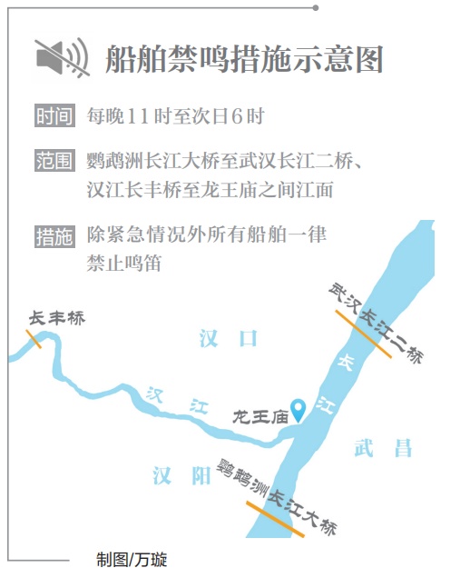 近日,武汉市首次在限定水域实施船舶夜间噪声管控。每晚11时至次日6时,武汉市鹦鹉洲长江大桥至武汉长江二桥、汉江长丰桥至龙王庙之间,总长约20公里的江面进入“静音模式”,除紧急情况外所有船舶一律禁止鸣笛,为两岸群众营造优质夜间休息环境。
