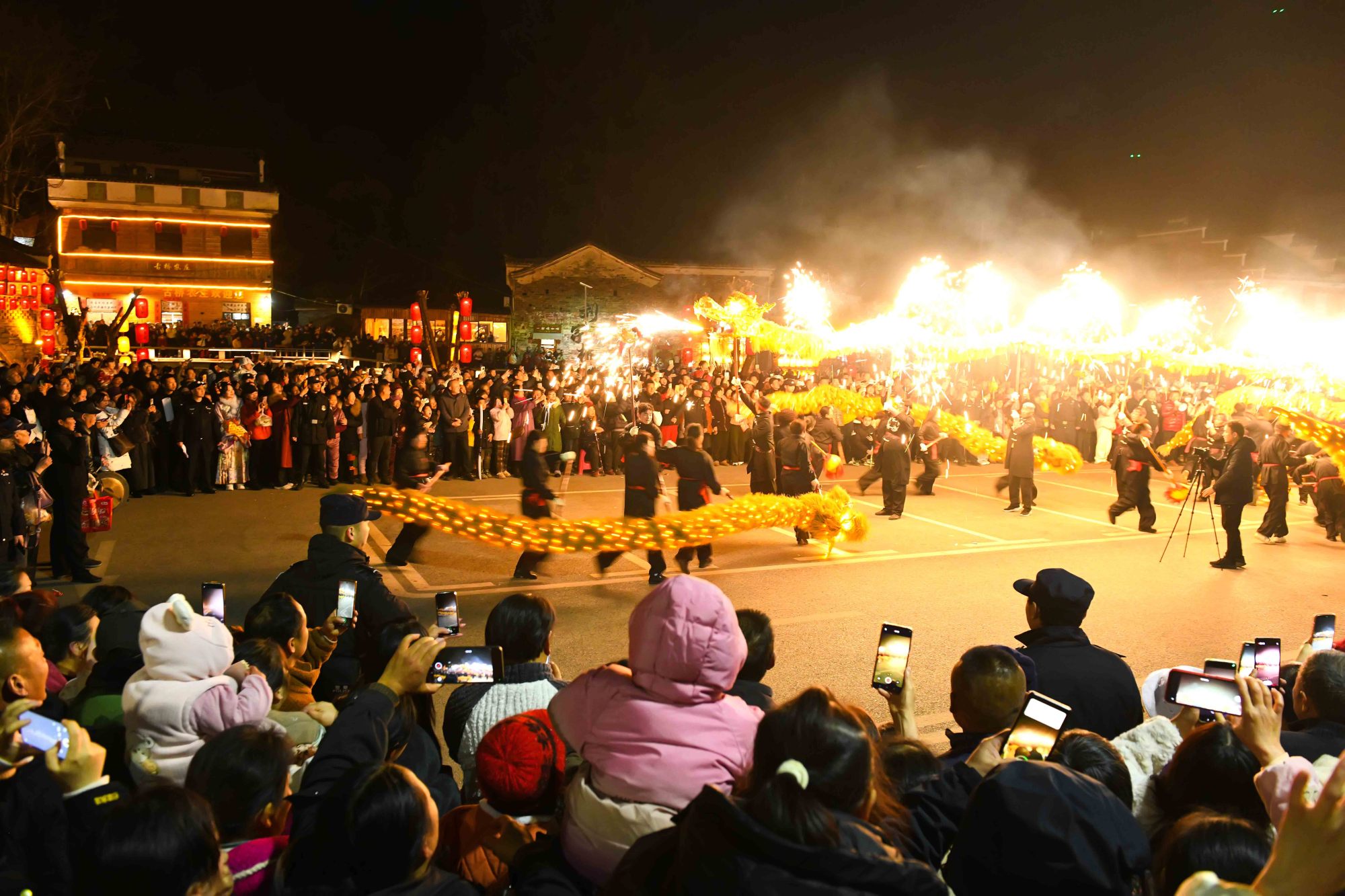 1月28日,咸安区桂花镇刘家桥景区张灯结彩,人声鼎沸,“非遗贺新春”天河金丝龙首演活动在此盛大举行。