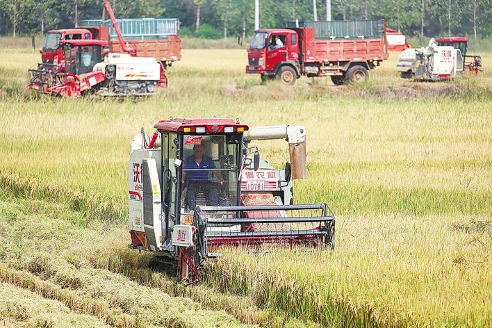 10月5日,咸宁市咸安区向阳湖现代农业科技示范园高标准农田的6000亩水稻迎来丰收季,农机手们抢抓国庆长假期间晴好天气收割水稻,确保粮食颗粒归仓,田间地头一片繁忙的丰收景象。