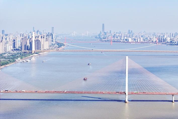 11月18日,武汉天空澄澈如洗。寒潮带来的强劲北风荡尽尘霾,长江武汉段能见度陡增,从高空俯瞰,白沙洲大桥、杨泗港大桥、鹦鹉洲大桥、长江大桥、长江二桥、二七大桥等六座跨江桥梁次第展开,形成“一眼望六桥”的壮丽画卷。