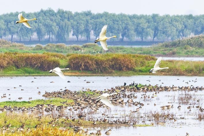 11月11日,武汉市东西湖区柏泉府河湿地,小天鹅在湿地上空盘旋飞翔。近年来当地加强湿地保护,生态持续向好,每年吸引大量候鸟前来越冬,一泓碧波,万羽翔集,绘就冬日生态画卷。