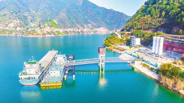 12月14日,秭归县归州镇LNG加注码头,一艘货运船舶正通过专用管线加注液化天然气清洁燃料。