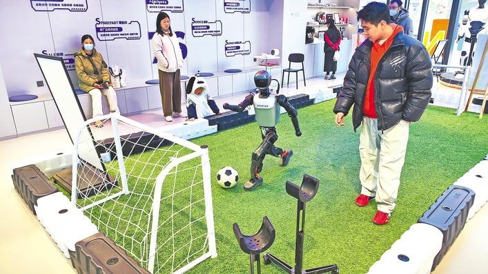 1月3日,在武汉市东湖高新区光谷创新天地商业公园的光谷人形机器人7S店,市民和游客兴致勃勃地与机器人互动,体验与机器人一起踢足球的乐趣。