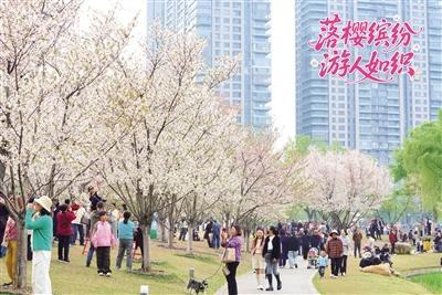 3月31日,尽管经历风雨、部分花瓣已悄然飘落,武汉市江汉区西北湖绿化广场内的400余株樱花依然吸引了大批市民前来。