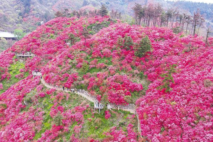 4月2日,武汉黄陂云雾山万亩野生杜鹃进入盛花期,花宇山、花海等核心赏花点漫山红遍,蔚为壮观。