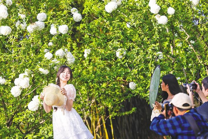 4月4日,武汉沙湖公园内绣球花竞相绽放,洁白花团缀满枝头,市民游客踏青赏花,拍照打卡,感受春日美好,乐享春假惬意时光。