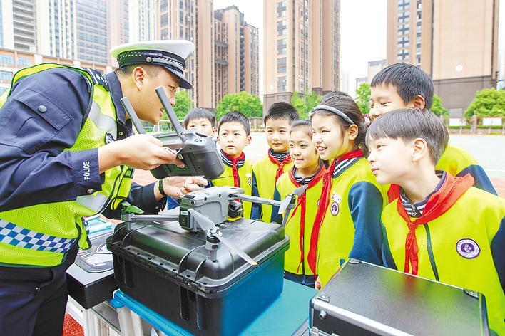 4月14日,民警在给学生们展示警用无人机。在第十一个全民国家安全教育日来临之际,襄阳警方走进襄阳市四十八中,开展“少年有志 强国有我 国家安全 人人有责”主题宣传活动。