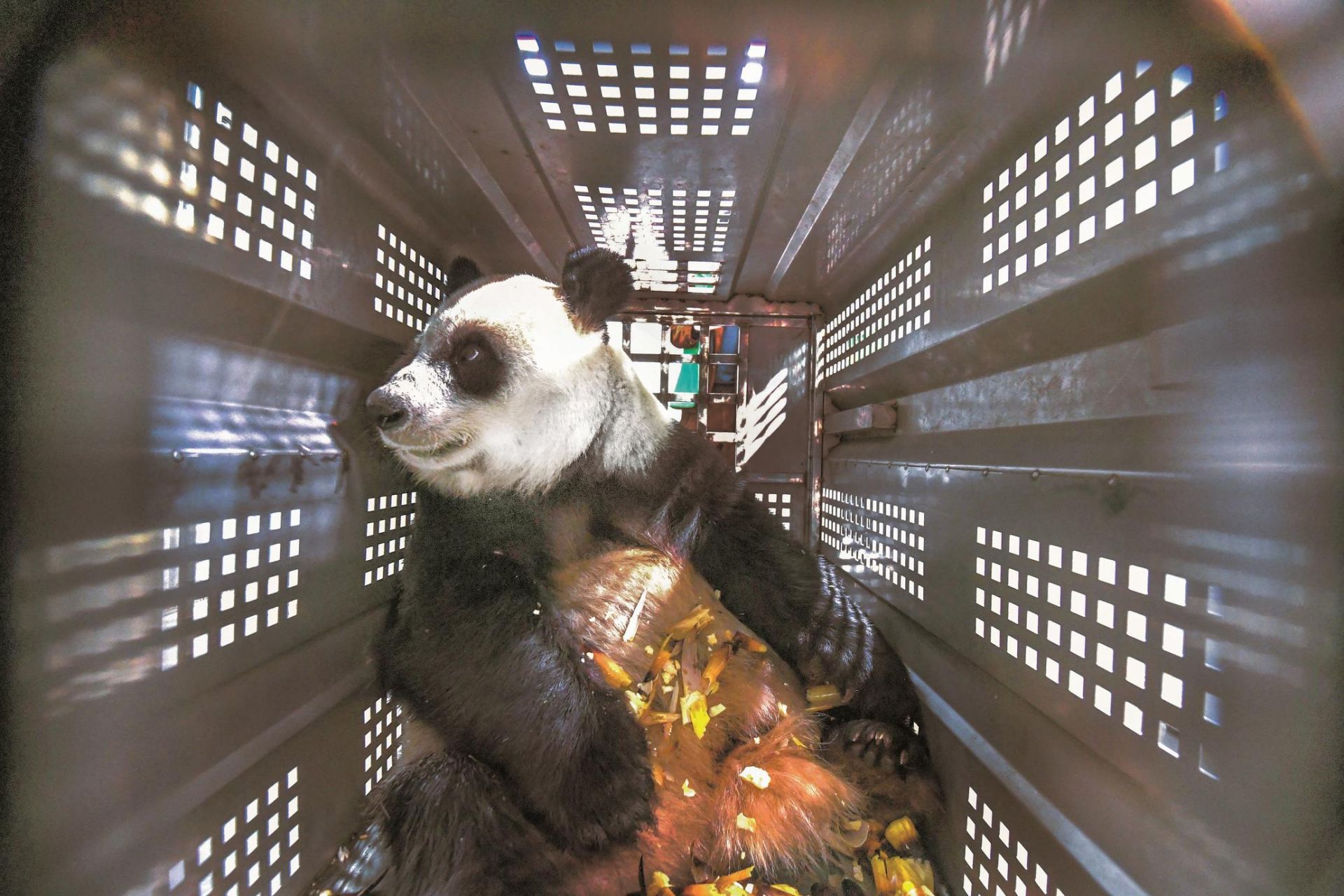 吃完竹笋,大熊猫胖妞看着笼外似有不舍,好像知道要离开武汉的家了。记者李辉摄