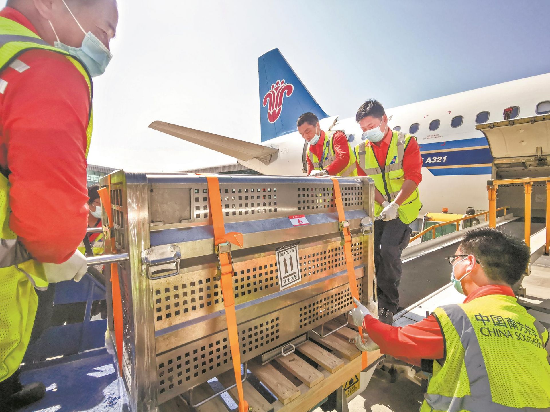 13时,抵达机场货运部,做登机前准备工作,饲养员曹骏和野保所所长汪明权一直陪伴左右。“陪着说话,它们就不会害怕。”
