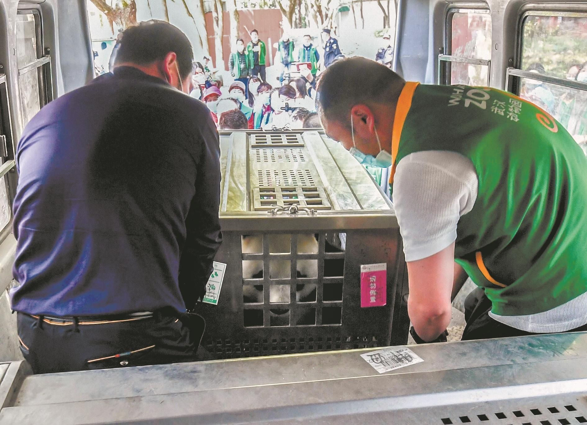 工作人员运送大熊猫姐妹花离开武汉动物园。记者李辉摄