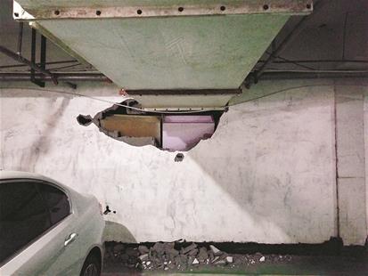 图为地下车库里的违建仓库和正常车位相邻,执法人员砸了一个洞后,就没再拆了