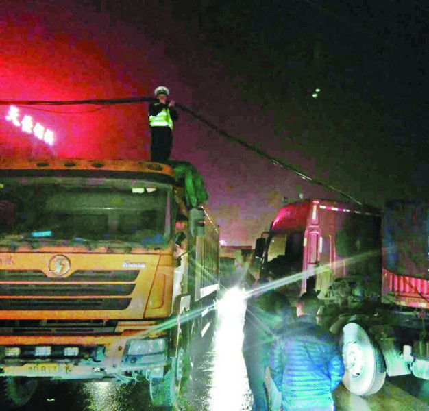 国道上电缆垂落影响车辆通行 交警雨夜手托电缆