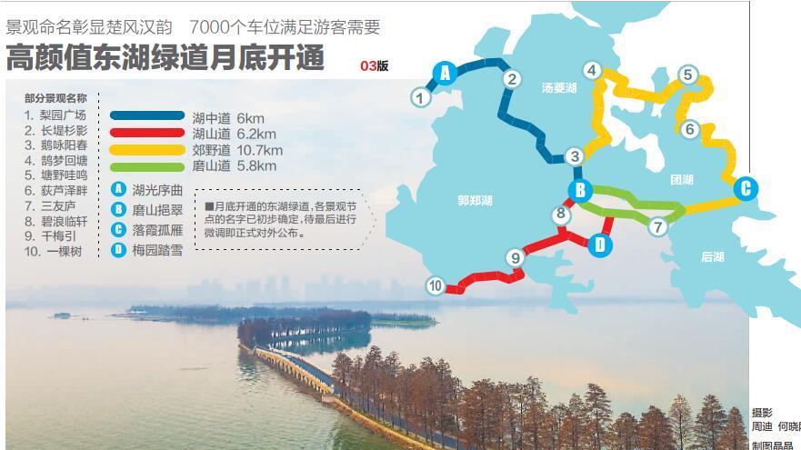 月底,高颜值的东湖绿道将正式开通,这条蜿蜒曲折的绿道荡漾在碧波东湖上,游客犹如在湖光山色中移步换景。东湖绿道沿途的景点、亭、桥、驿站的命名尽显楚风汉韵,行走其间,再配上美景,别有一番雅趣。