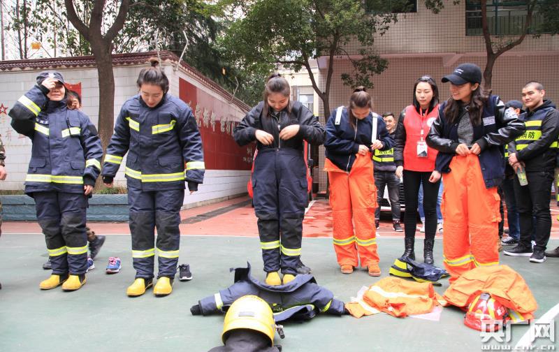 为了让队员近距离接触消防官兵的生活和工作,在消防官兵的指导下,各位女队员穿上抢险救援服、亲身体验手持消防水枪扑救初期火灾, 体验了一回当“消防员”的滋味。