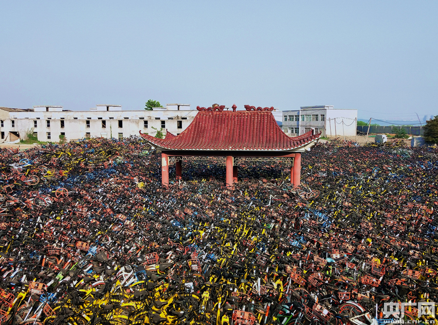 近日,湖北省武汉市洪山区世茂林屿岸小区附近的一块空地上堆满了共享单车,空地中的凉亭变“孤岛”。