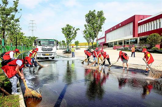 8月2日,志愿者们清扫军事五项场馆道路。中国一冶志愿者与武汉市青山区冶金街名流社区志愿者结对共建,40余名志愿者来到由中国一冶承建的军运会军事五项场馆,开展“我的军运我的家”服务活动。他们冒着高温酷暑,对军事五项场馆进行了全方位的深度清扫,提升军运会比赛场馆的综合环境。