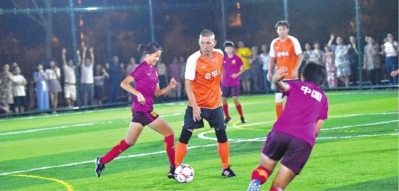 9月1日,社区足球赛开幕式在汉阳夹河街社区足球场举行,老甲A队与中国U14女足国家队进行表演赛 长江日报记者许魏巍 摄