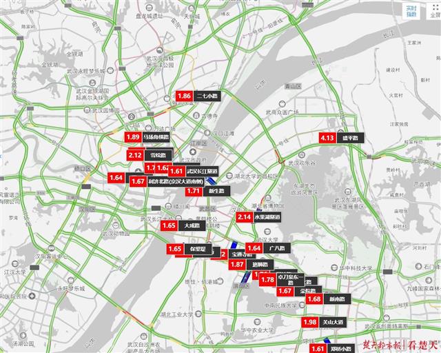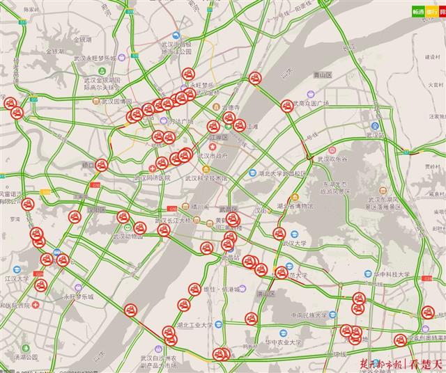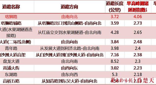 预计下周最堵的路段依次是:青年路(发展大道至利济北路)、武汉大道(红庙立交至水果湖隧道)、黄浦大街(由西向东)、长江隧道(楚汉路至大智路)、长江隧道(大智路至楚汉路)、珞狮路(由南向北)、二环线(由西向东进入竹叶山立交)、香港路(唐家墩路至球场街)、高桥五路(知青路至东吴大道)、珞狮路(由北向南)。