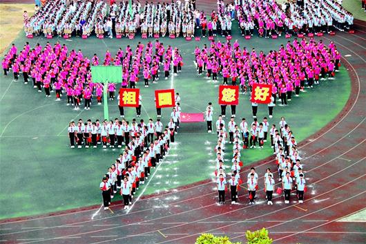 图为:蔡甸区奓山中心小学学生的“祖国您好”造型